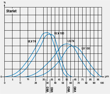Starlet con palanca de mano y de detención para funcionamiento continuo. Con el FONTAN Starlet es posible trabajar tanto con el proceso ULV con cantidades de transporte de entre 2,6 y 10,8 l/h o con el proceso LV con cantidades de transporte entre 7 y 50 l/h, según el tamaño de boquilla seleccionado. Niebla generada por FONTAN Starlet
